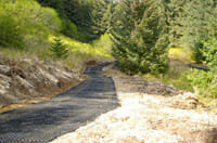 ton Larson Bay Road. With its heavy rainfall and poor soils, Kodiak poses some interesting challenges. The original trail was an eroded mess. We used excavators to create a new trail tread, which ITN covered with GeoBlock, a system of interlocking plastic grid panels which distributes weight and preserves the integrity of the trail tread.