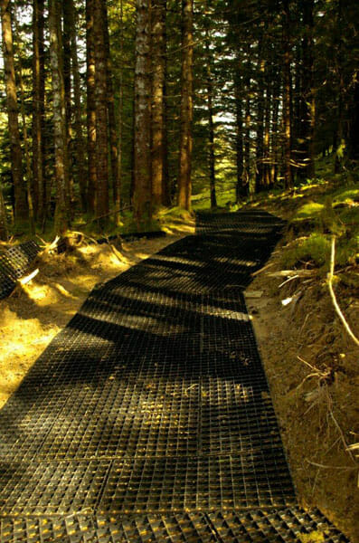 ton Larson Bay Road. With its heavy rainfall and poor soils, Kodiak poses some interesting challenges. The original trail was an eroded mess. We used excavators to create a new trail tread, which ITN covered with GeoBlock, a system of interlocking plastic grid panels which distributes weight and preserves the integrity of the trail tread.