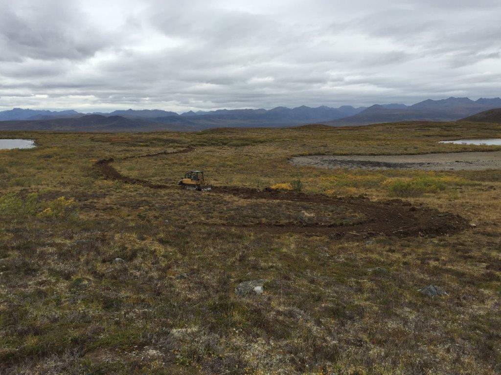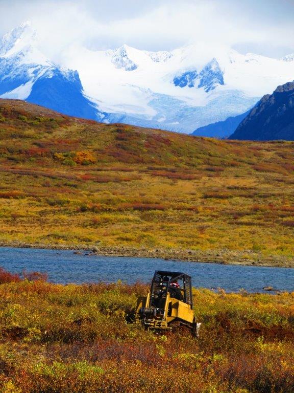 High tundra and mountain lakes sparkle in the foreground while Mt. Deborah and the Maclaren Glacier loom behind. To the east, the Maclaren Valley slices from the glacier south, broadening toward the sunlight. Clouds dapple the landscape and sky with moving shadows and chameleon shades on the water and fall colors. We are building trail across this dreamscape. How in the world did we land an incredible gig like this? I feel like Michaelangelo with a perfect block of marble. Really? I get to build an original trail here?